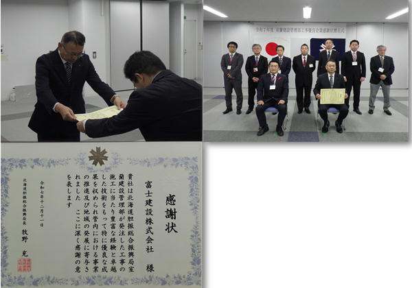 12月11日 胆振総合振興局室蘭建設管理部様より、優良企業表彰として感謝状をいただきました。